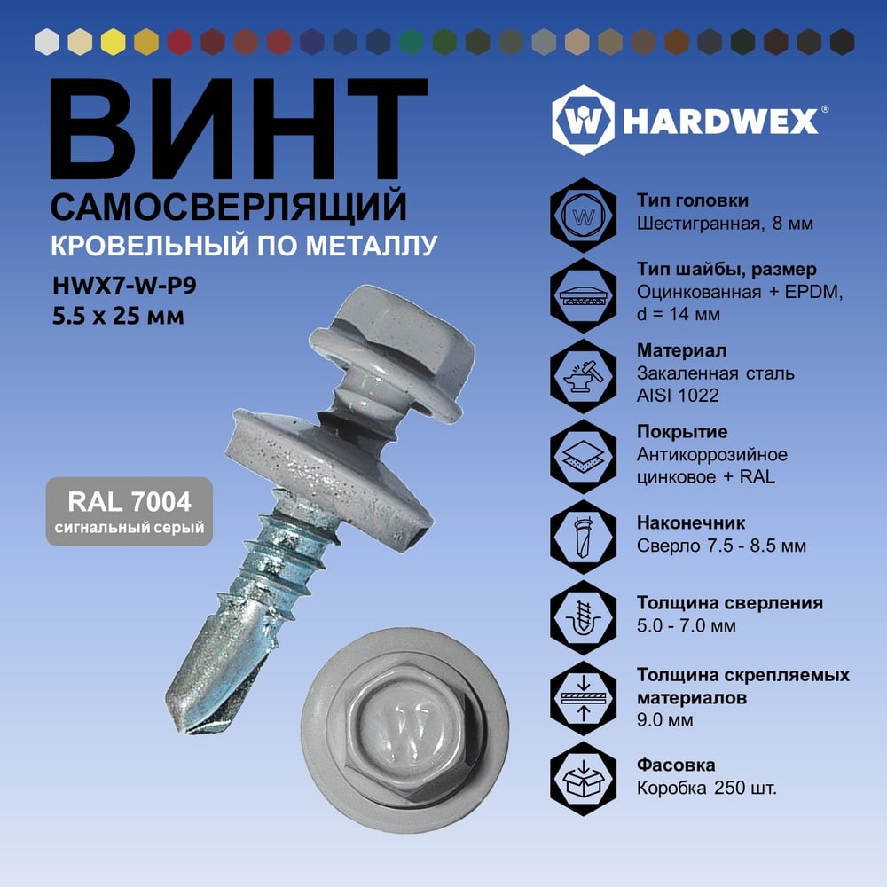 Саморез кровельный по металлу HARDWEX ТМ HWX7-W-P9-5.5x25 мм, св.№3, RAL 7004, 250 шт. 5190000023958