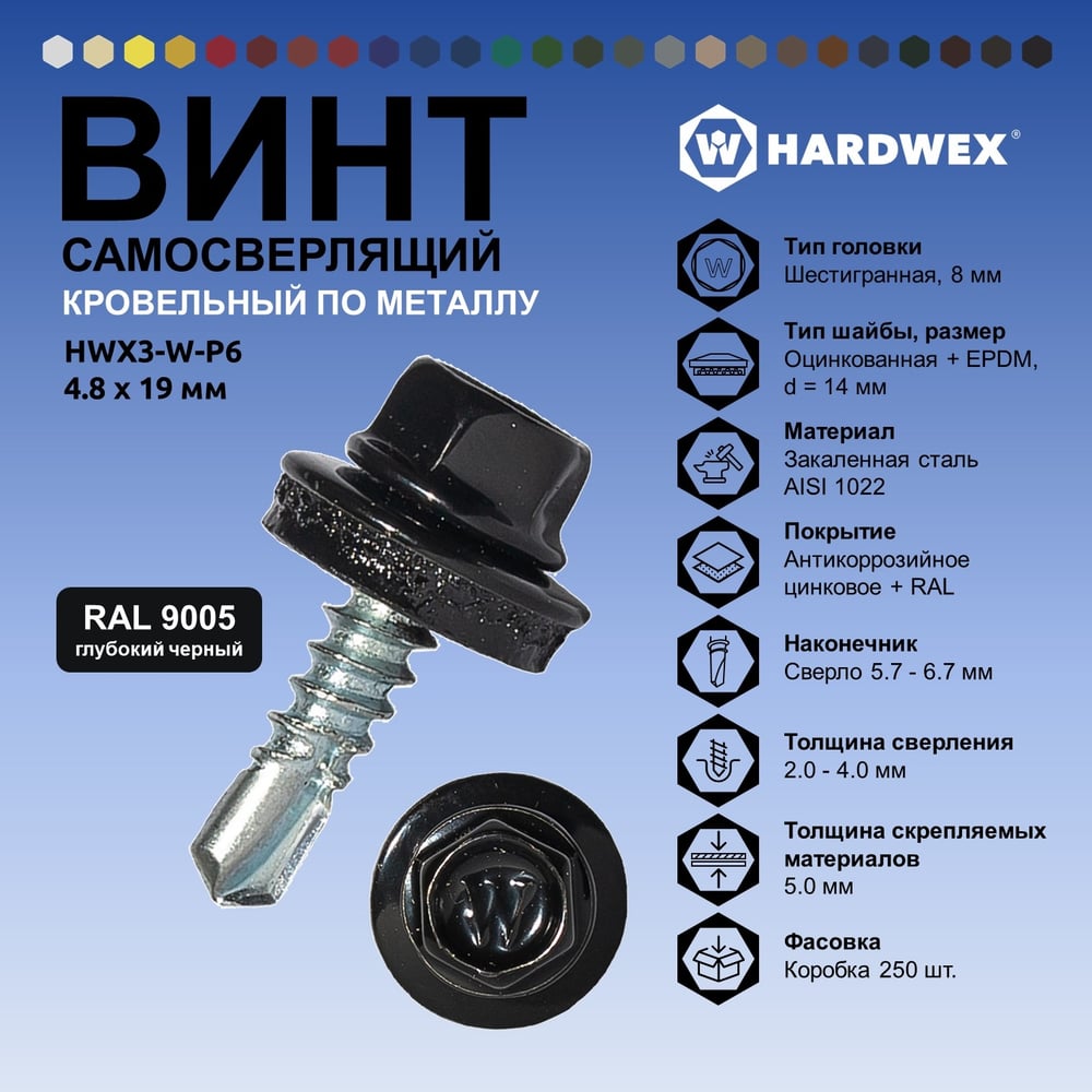 Саморез кровельный по металлу HARDWEX ТМ HWX4-W-P7-4.8x19 мм, св.№2, RAL 9005, 250 шт. 5190000000676