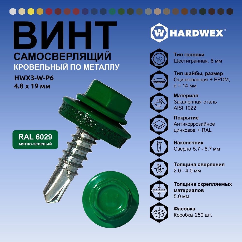 Саморез кровельный по металлу HARDWEX ТМ HWX4-W-P7-4.8x19 мм, св.№2, RAL 6029, 250 шт. 5190000000591
