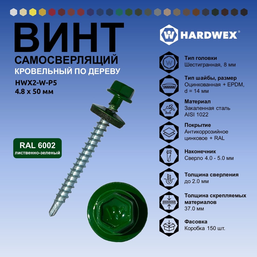 Саморез кровельный по дереву HARDWEX ТМ HWX2-W-P5-4.8x50 мм, св.№1, RAL 6002, 200 шт. 5190000023057