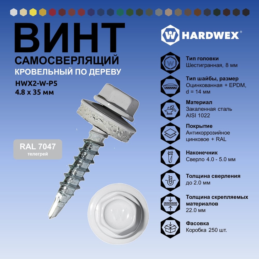 Саморез кровельный по дереву HARDWEX ТМ HWX2-W-P5-4.8x35 мм, св.№1, RAL 7047, 250 шт. 5190000002144