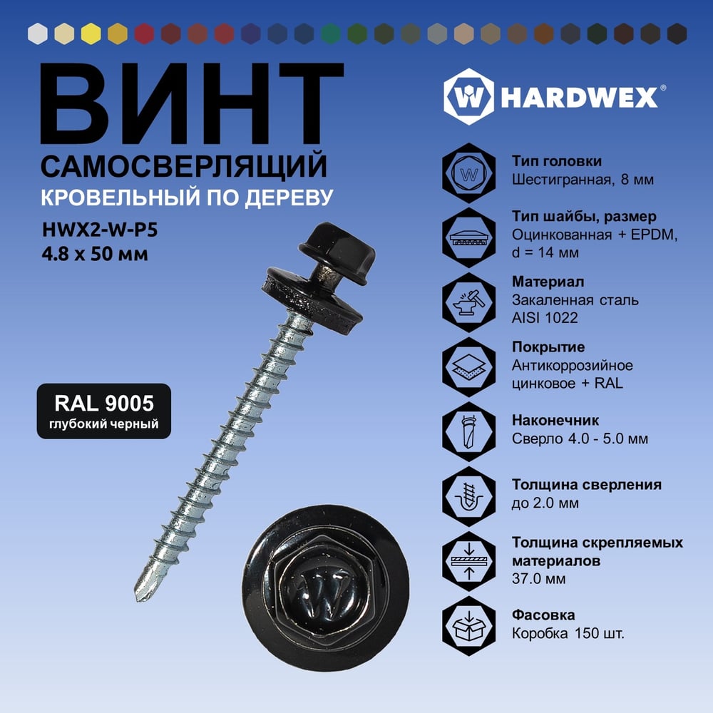 Саморез кровельный по дереву HARDWEX ТМ HWX2-W-P5-4.8x50 мм, св.№1, RAL 9005, 200 шт. 5190000023156