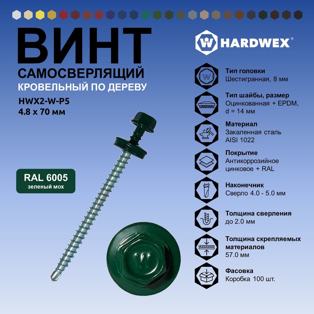 Саморез кровельный по дереву HARDWEX ТМ HWX2-W-P5-4.8x70 мм, св.№1, RAL 6005, 100 шт. 5190000023354