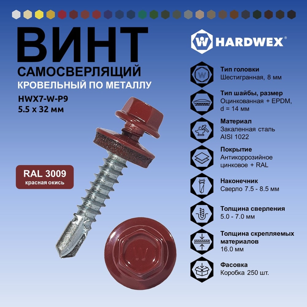 Саморез кровельный по металлу HARDWEX ТМ HWX7-W-P9-5.5x32 мм, св.№3, RAL 3009, 200 шт. 5190000239885