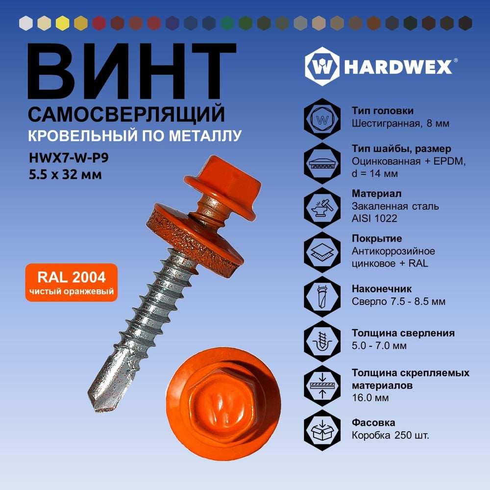 Саморез кровельный по металлу HARDWEX ТМ HWX7-W-P9-5.5x32 мм, св.№3, RAL 2004, 200 шт. 5190000239854