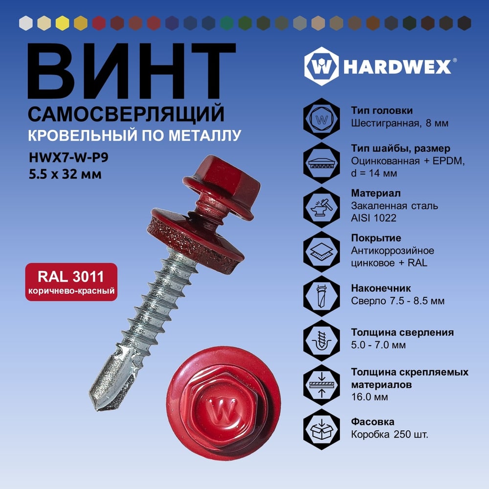 Саморез кровельный по металлу HARDWEX ТМ HWX7-W-P9-5.5x32 мм, св.№3, RAL 3011, 200 шт. 5190000239892