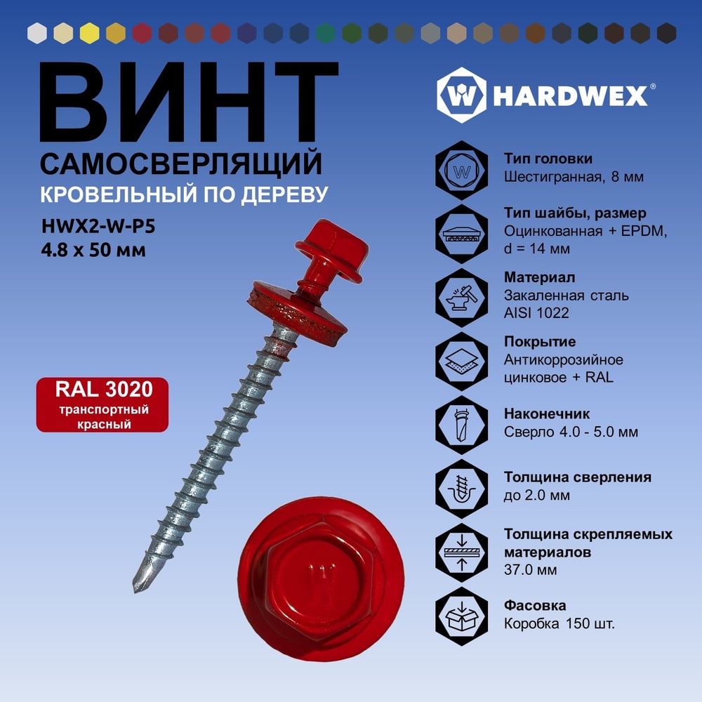 Саморез кровельный по дереву HARDWEX ТМ HWX2-W-P5-4.8x50 мм, св.№1, RAL 3020, 200 шт. 5190000023002