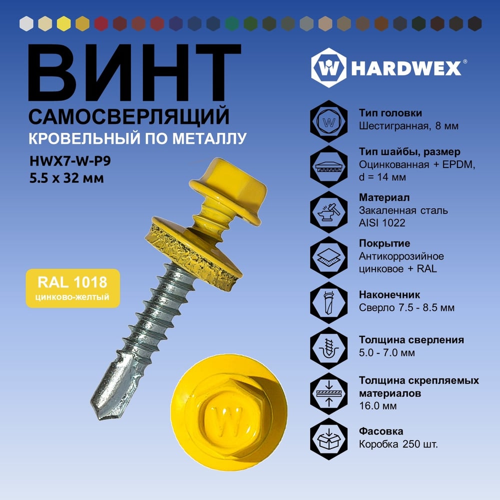 Саморез кровельный по металлу HARDWEX ТМ HWX7-W-P9-5.5x32 мм, св.№3, RAL 1018, 200 шт. 5190000239847
