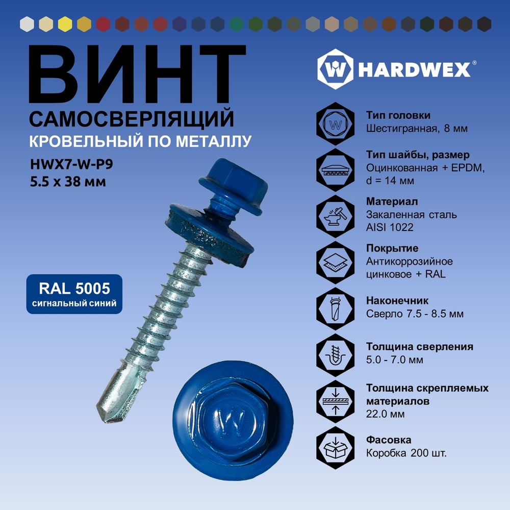 Саморез кровельный по металлу HARDWEX ТМ HWX7-W-P9-5.5x38 мм, св.№3, RAL 5005, 150 шт. 5190000240218