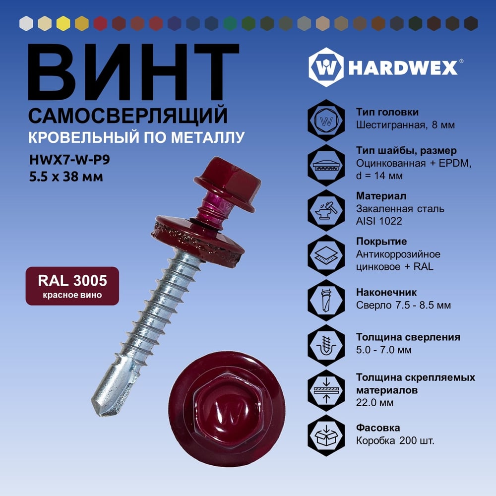 Саморез кровельный по металлу HARDWEX ТМ HWX7-W-P9-5.5x38 мм, св.№3, RAL 3005, 150 шт. 5190000240164