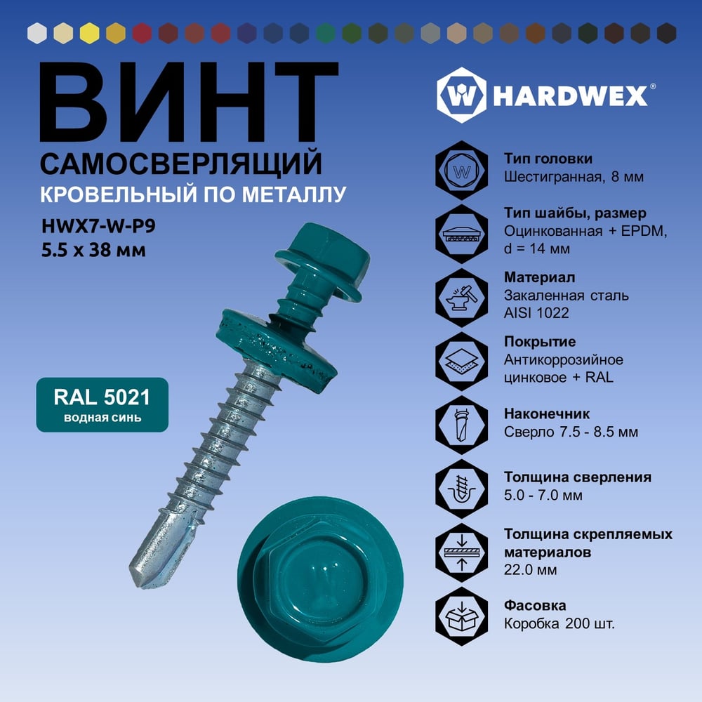 Саморез кровельный по металлу HARDWEX ТМ HWX7-W-P9-5.5x38 мм, св.№3, RAL 5021, 150 шт. 5190000240232