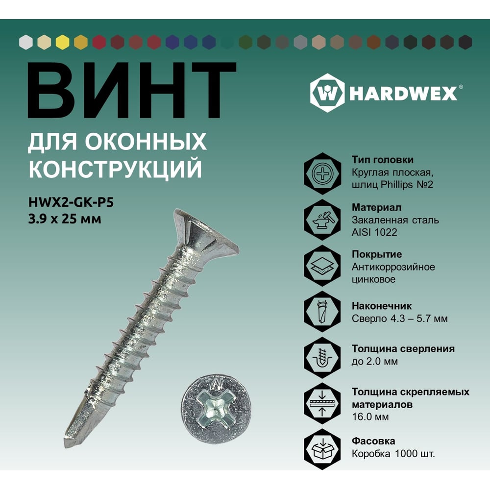 Саморез для оконных конструкций HARDWEX ТМ HWX2-GK-P5-3.9x25 мм, св.№3, Phillips №2, цинк, 1000 шт. 3000000000564