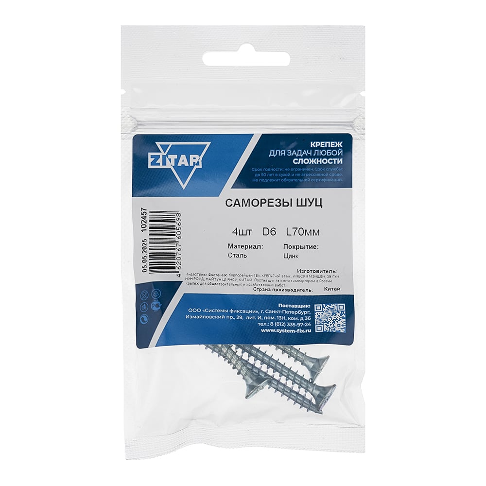 Саморез ШУц с потайной головкой 6,0x70 мм, 4 шт., пакет Zitar 102457