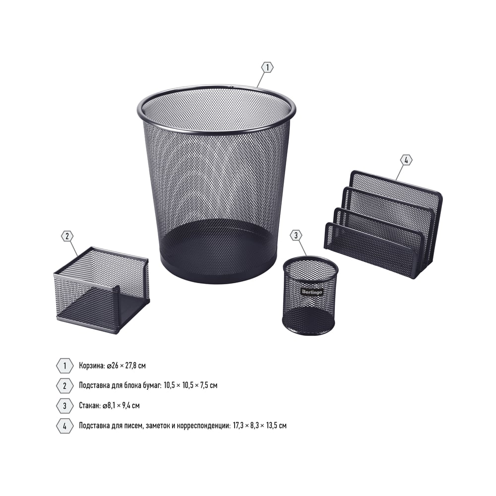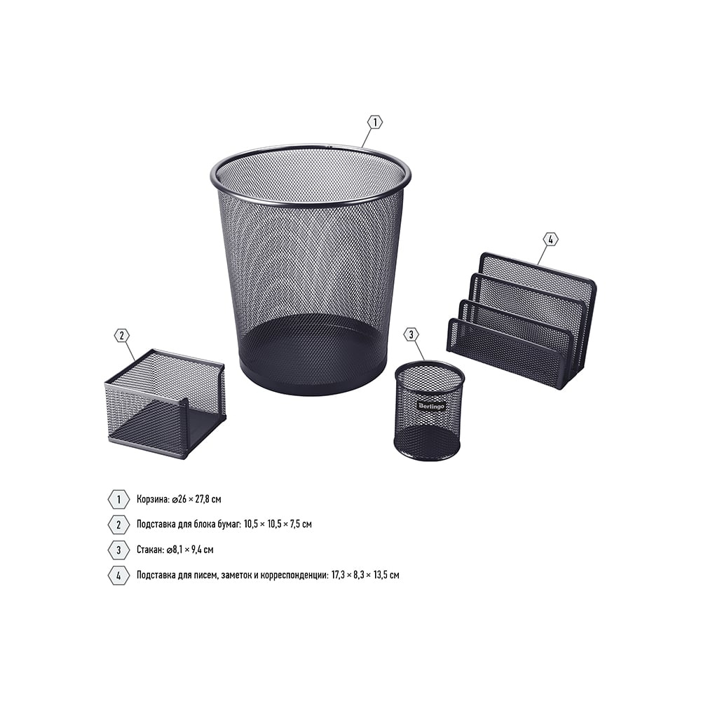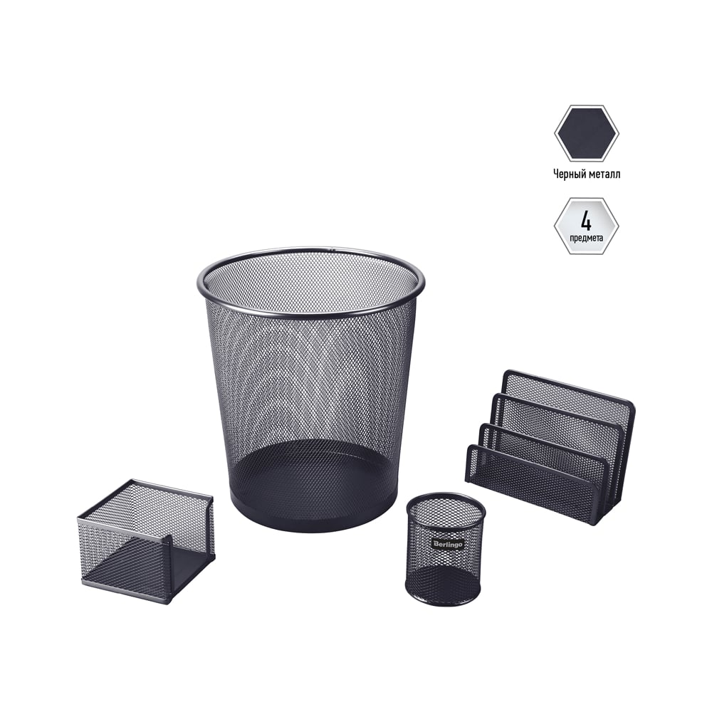 Настольный набор BERLINGO Steel&Style из металла, 4 предмета, с корзиной, черный BMs_41412