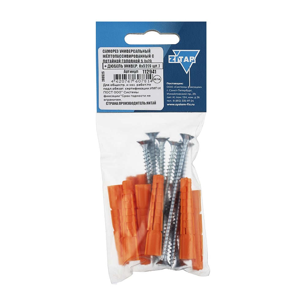 Саморез ШУж с потайной головкой 5,0x70 мм + дюбель универсальный 8x52 мм, 9 шт в пакете Zitar 112941