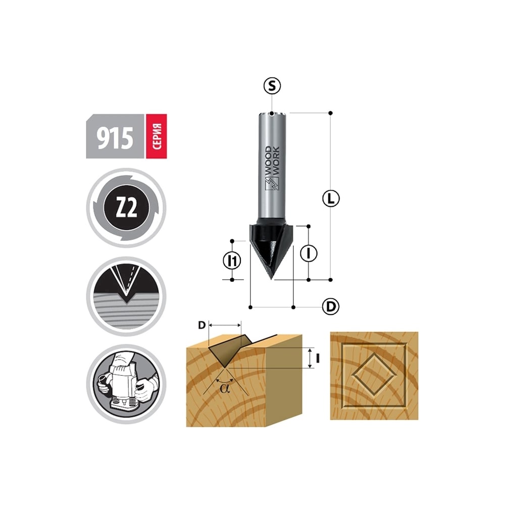 Фреза V-образная для гравировки 31.8х26х64 мм, хв-к 12 мм, угол 90 градусов WOODWORK 915.3290.12