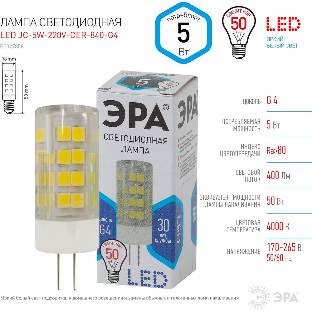 Светодиодная лампа ЭРА LED smd JC-5w-220V-corn, ceramics-840-G4 Б0027858