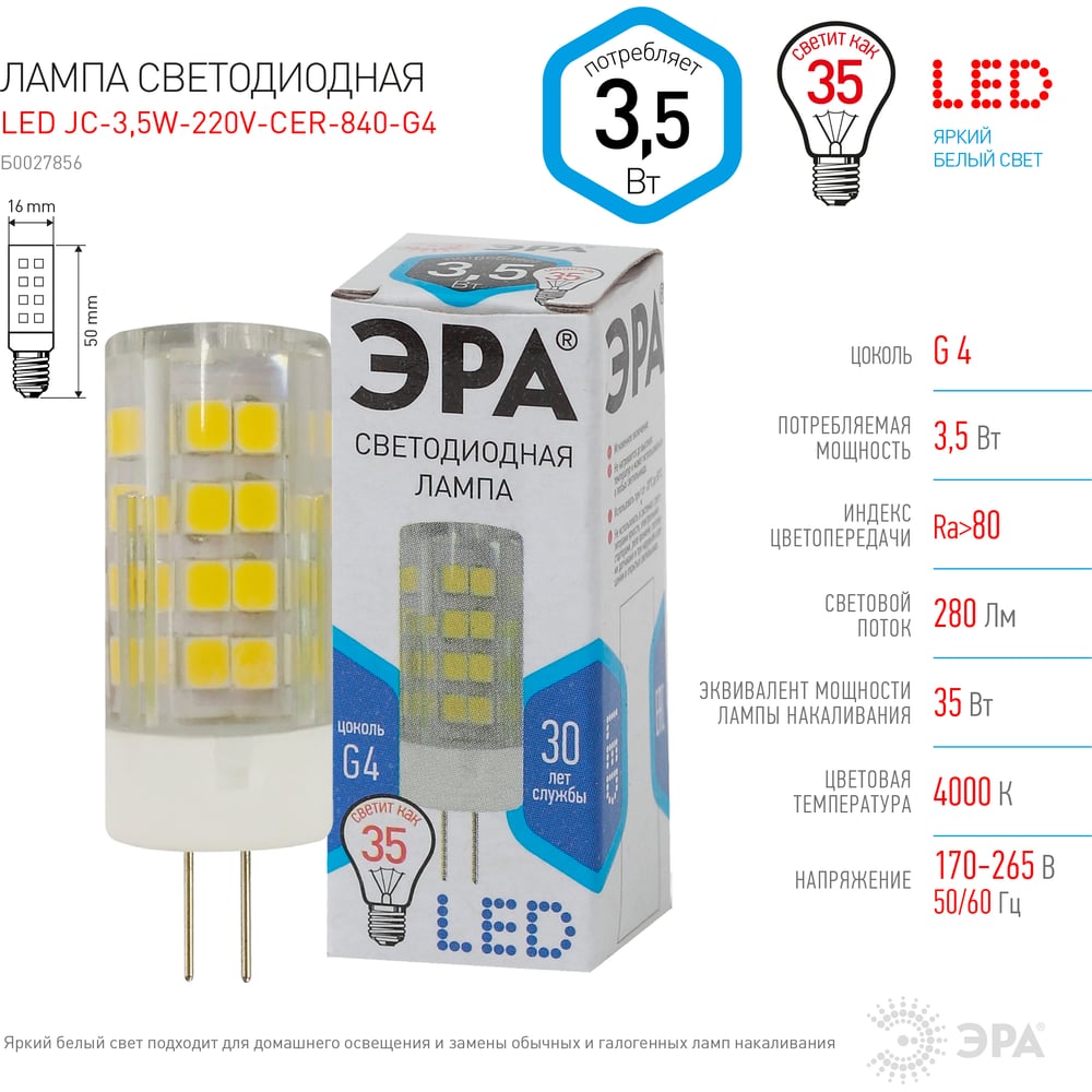 Светодиодная лампа ЭРА LED smd JC-3,5w-220V-corn, ceramics-840-G4 Б0027856