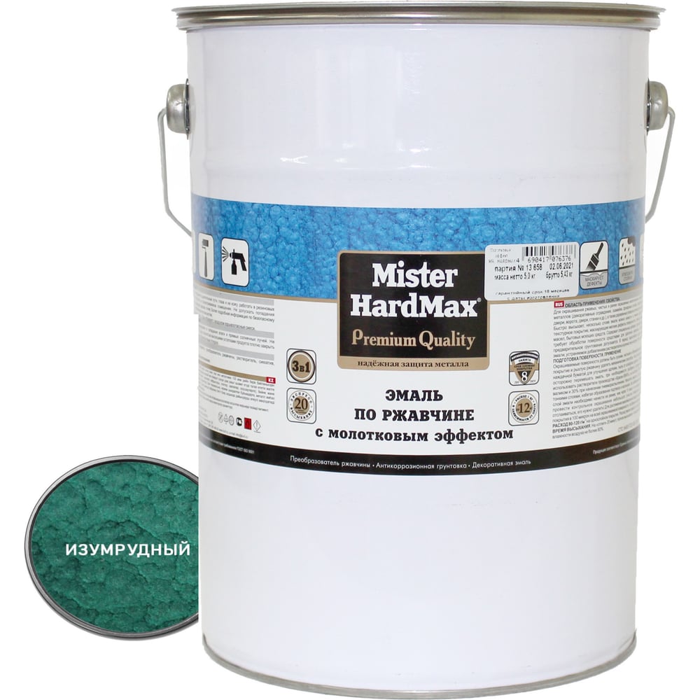 Эмаль по ржавчине с молотковым эффектом HardMax изумрудная, барабан 5 кг 4690417076222