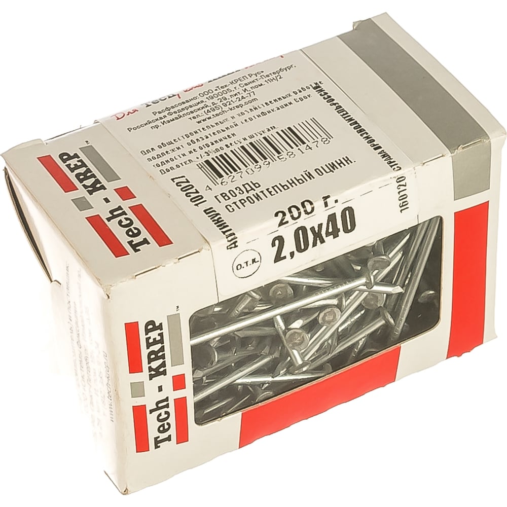 Строительный оцинкованный гвоздь 2.0х40, 200г - коробка Tech-Krep 102027