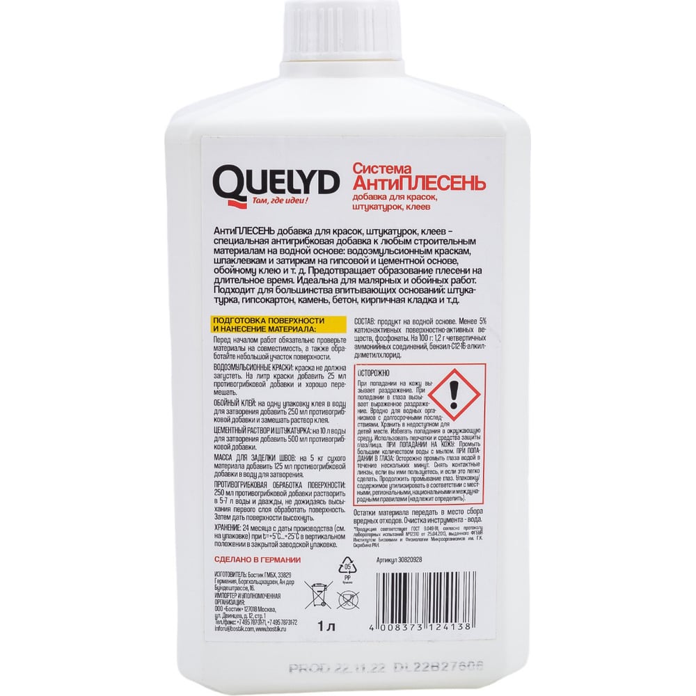 Антиплесень QUELYD Добавка для красок, штукатурок, клеев 1л 30820928