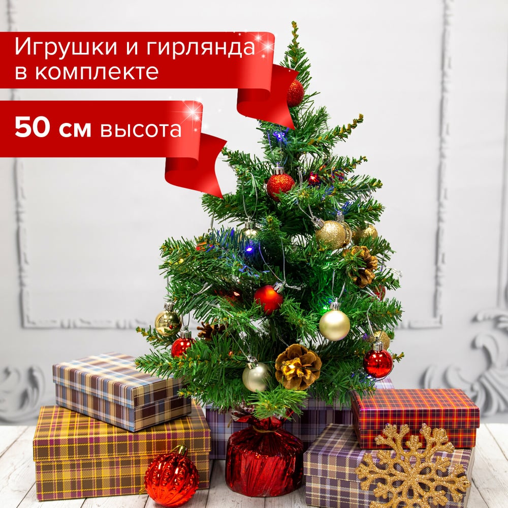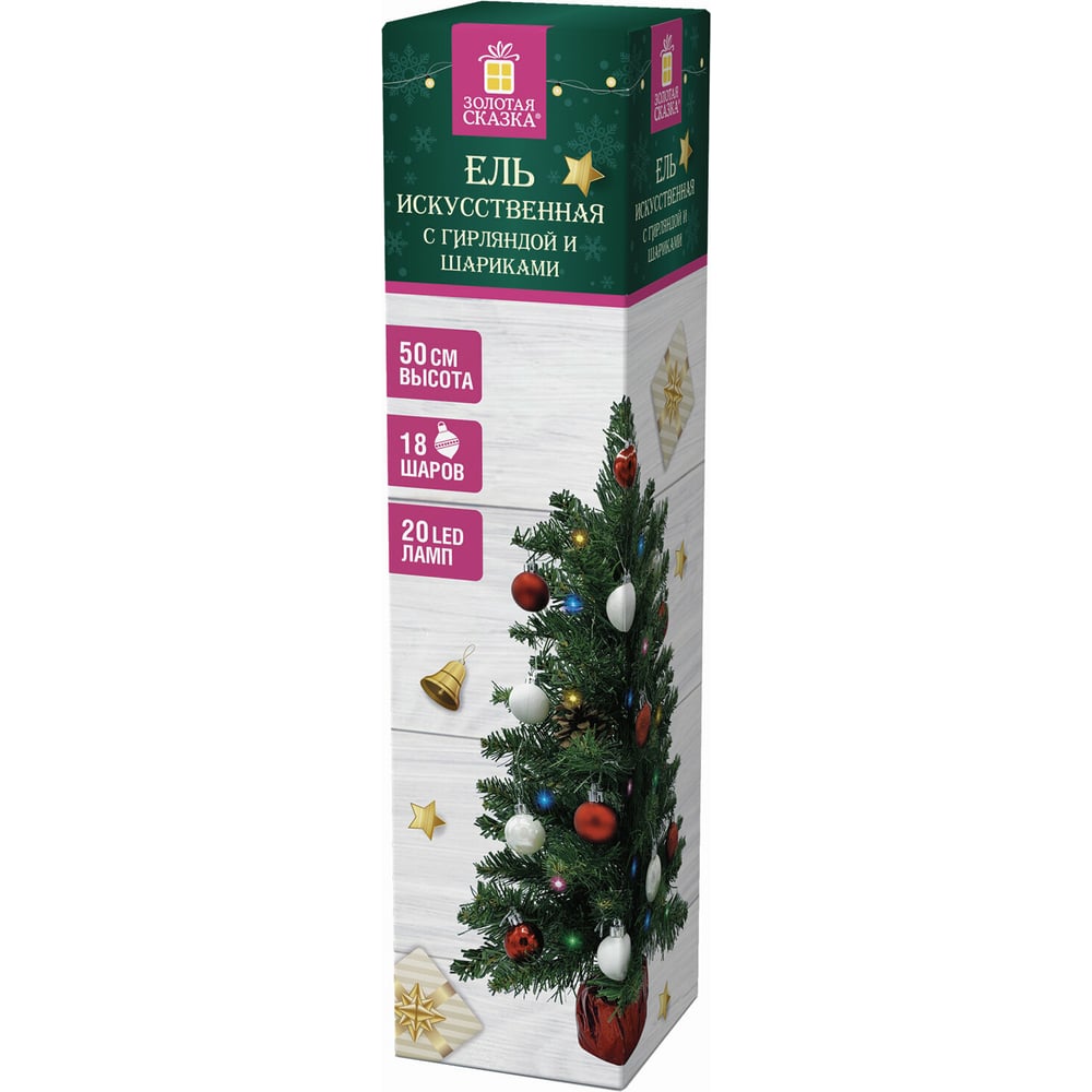 Искусственная новогодняя декоративная ель Золотая сказка 50 см, зеленая, с гирляндой и игрушками 591316
