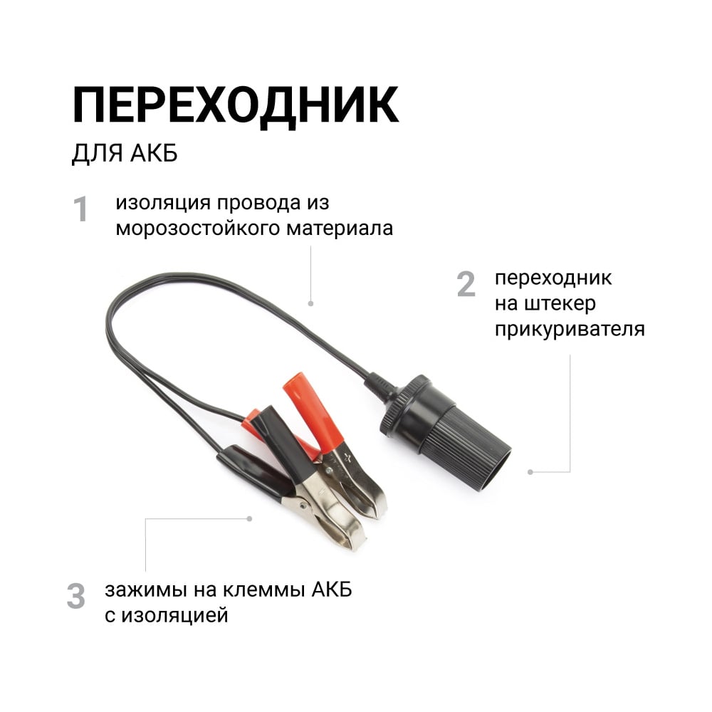 | Подключение | к клеммам аккумулятора и к прикуривателю |
