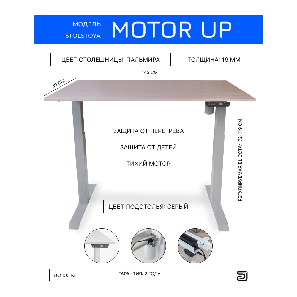 Стол с регулируемой высотой StolStoya МОТОР UP рама серая, столешница ЛДСП, Пальмира, 145x80 PE211ISSLP145