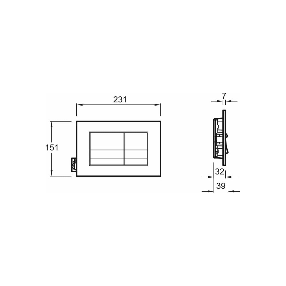 Габариты без упаковки 231х39х151 мм Высота 151 мм Материал пластик Ширина 231 мм Цвет глянцевый хром Тип клавиши для инсталляций к унитазам Глубина 39 мм Палитра серый Управление ручное(механическое) Режим слива воды двухрежимный