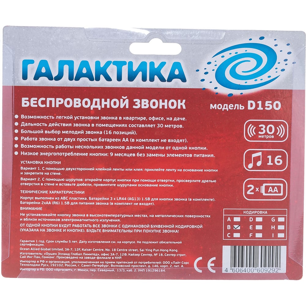 Звонок ГАЛАКТИКА D-150 на батарейках, 16 мелодий, б/проводная кнопка 4606400609292