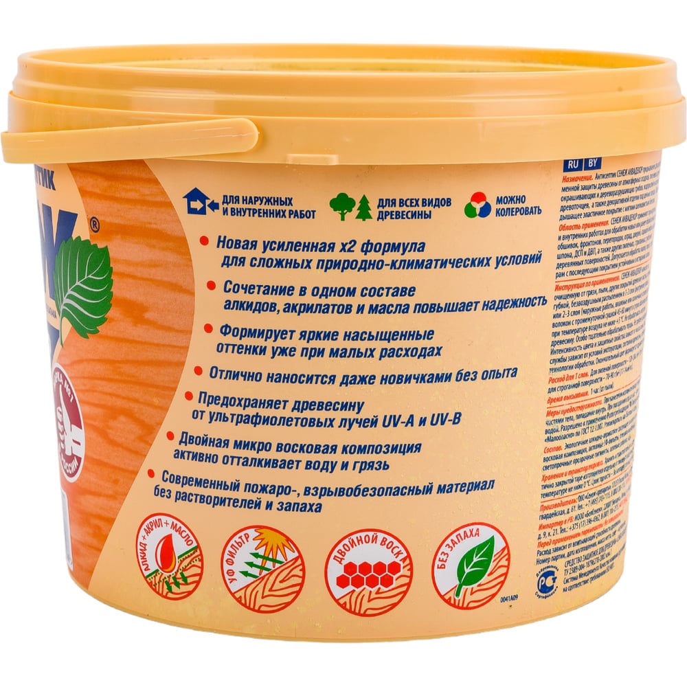 | Состав | состав на алкидно-акрилатной основе с добавлением льняного масла, биоцидов, активных УФ-фильтров, микровосков |