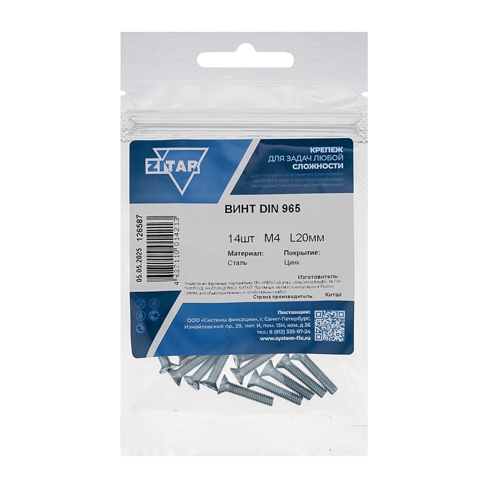 Винт Zitar DIN965 с потайной головкой оцинкованный М4x20, 14 шт. (пакет) 126587