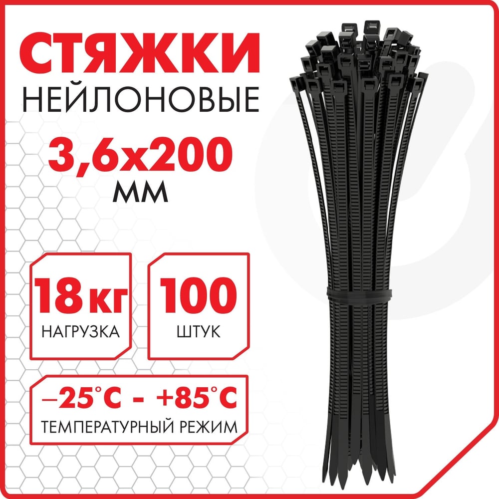 Длина 200 мм Материал нейлон Ширина 3.6 мм Цвет черный Тип стяжка ГОСТ нет Фасовка 100 шт Многоразовые нет С маркировочной площадкой нет С отверстием (под саморез) нет С клипсой нет С двойным замком нет Стойкость к ультрафиолету да Температура монтажа Min -20 °С Температура монтажа Max 60 °С Рабочая температура Max 85 °С Рабочая температура Min -25 °С