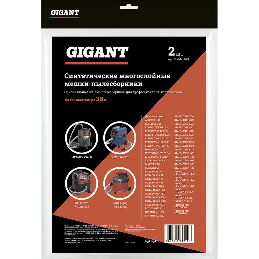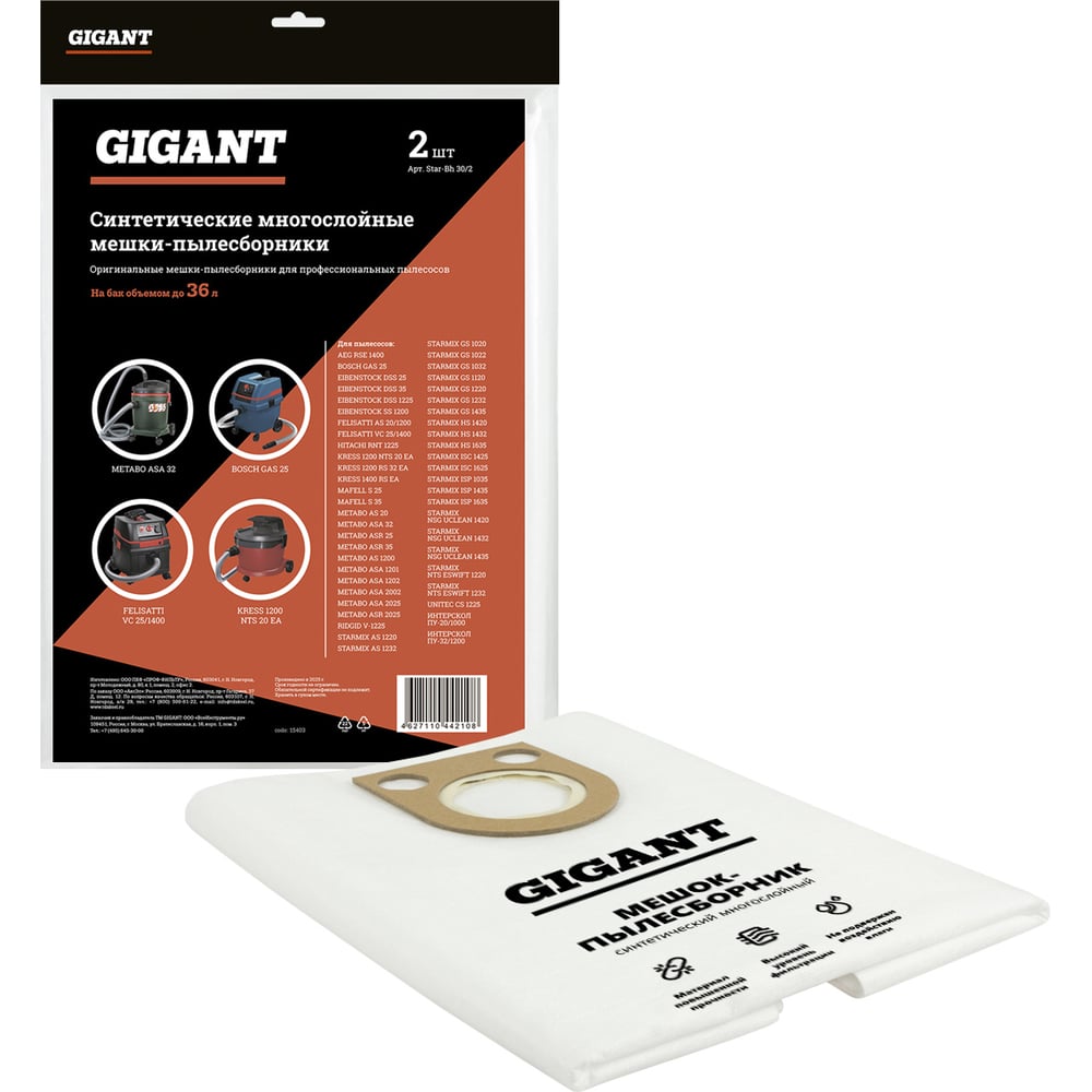Мешки для профессиональных пылесосов 2 шт. (36 л) Gigant Star-Bh 30/2 Star-Bh30/2 (Россия)