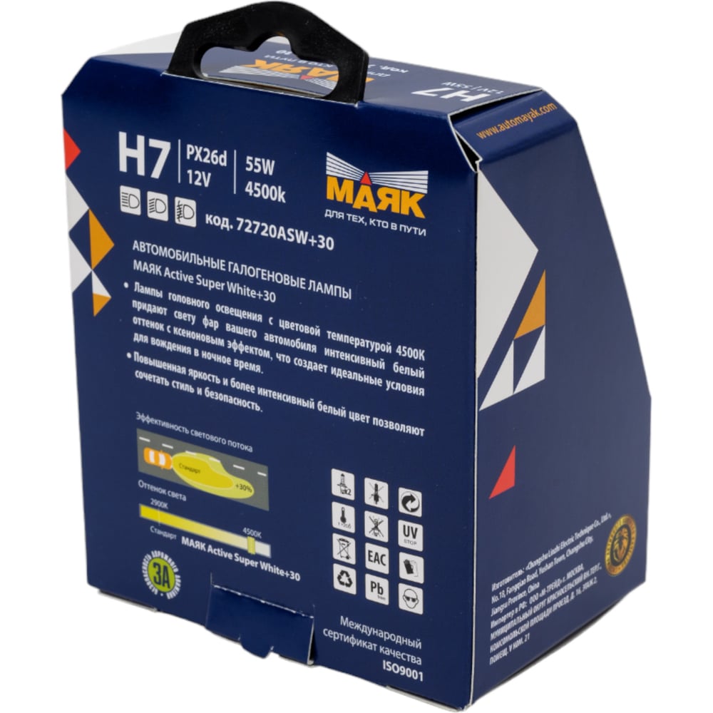 Автомобильная галогенная лампа МАЯК H7, 12V, 55W, PX26d Active Super White +30%, 2 шт. 72720ASW+30