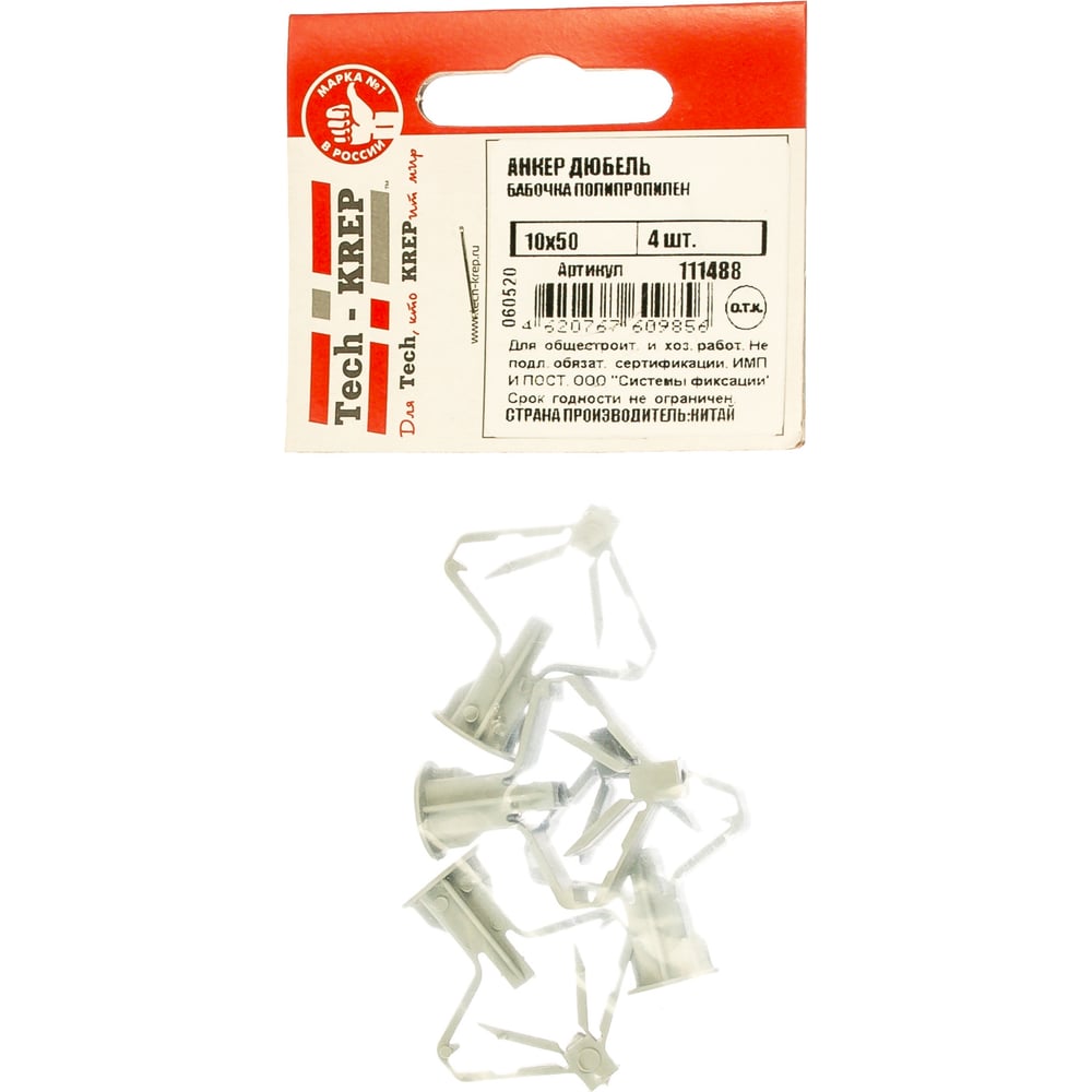 Дюбель-анкер Бабочка, полипропилен 10х50, 4шт - пакет Tech-Krep 111488