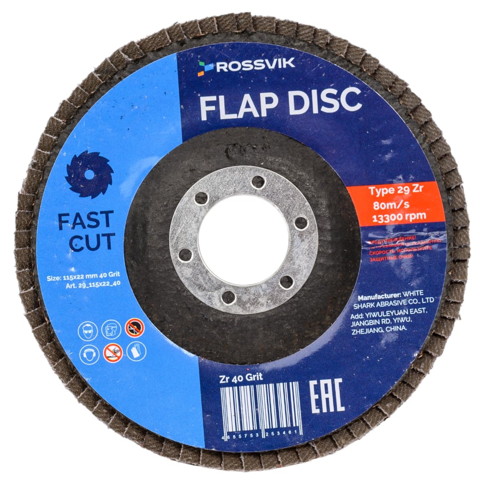 Круг шлифовальный лепестковый Тип 29 115x22 мм, P 40, Zr, 80 м/с, 12250 об/мин Rossvik 29_115х22_40