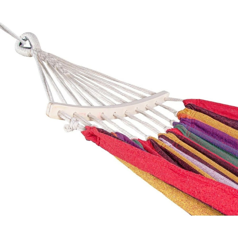 Габариты без упаковки 2000х1000 мм Покрытие нет Цвет разноцветный Вид гамак Вес нетто 1.5 кг Вид крепления веревка Вместимость 1.5 Max нагрузка 150 кг Материал полотна хлопок Водонепроницаемость нет Москитная сетка нет Чехол/сумка в комплекте да Планка да Каркас нет Ширина полотна 100 см Длина полотна 200 см Тип полотна ткань Материал планки дерево