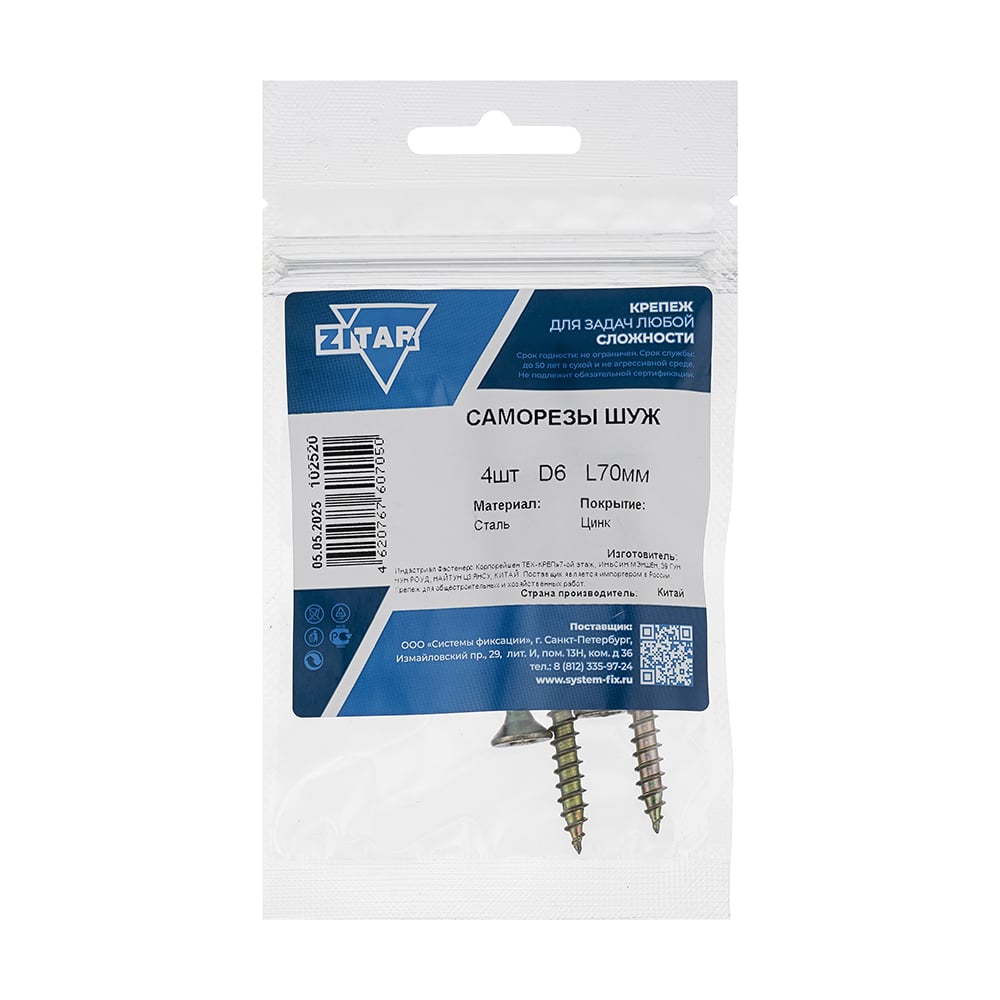 Саморез ШУж с потайной головкой 6,0x70 мм, 4 шт в пакете Zitar 102520
