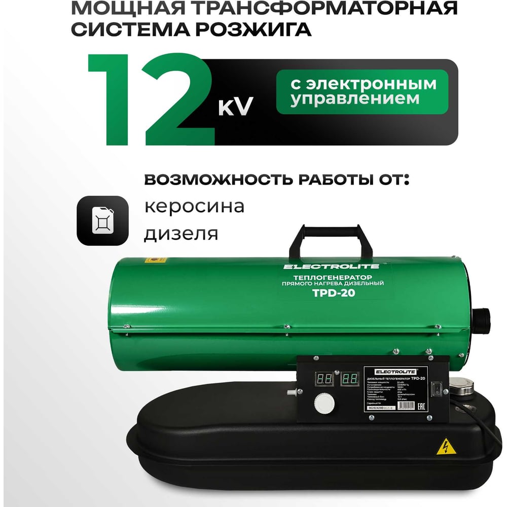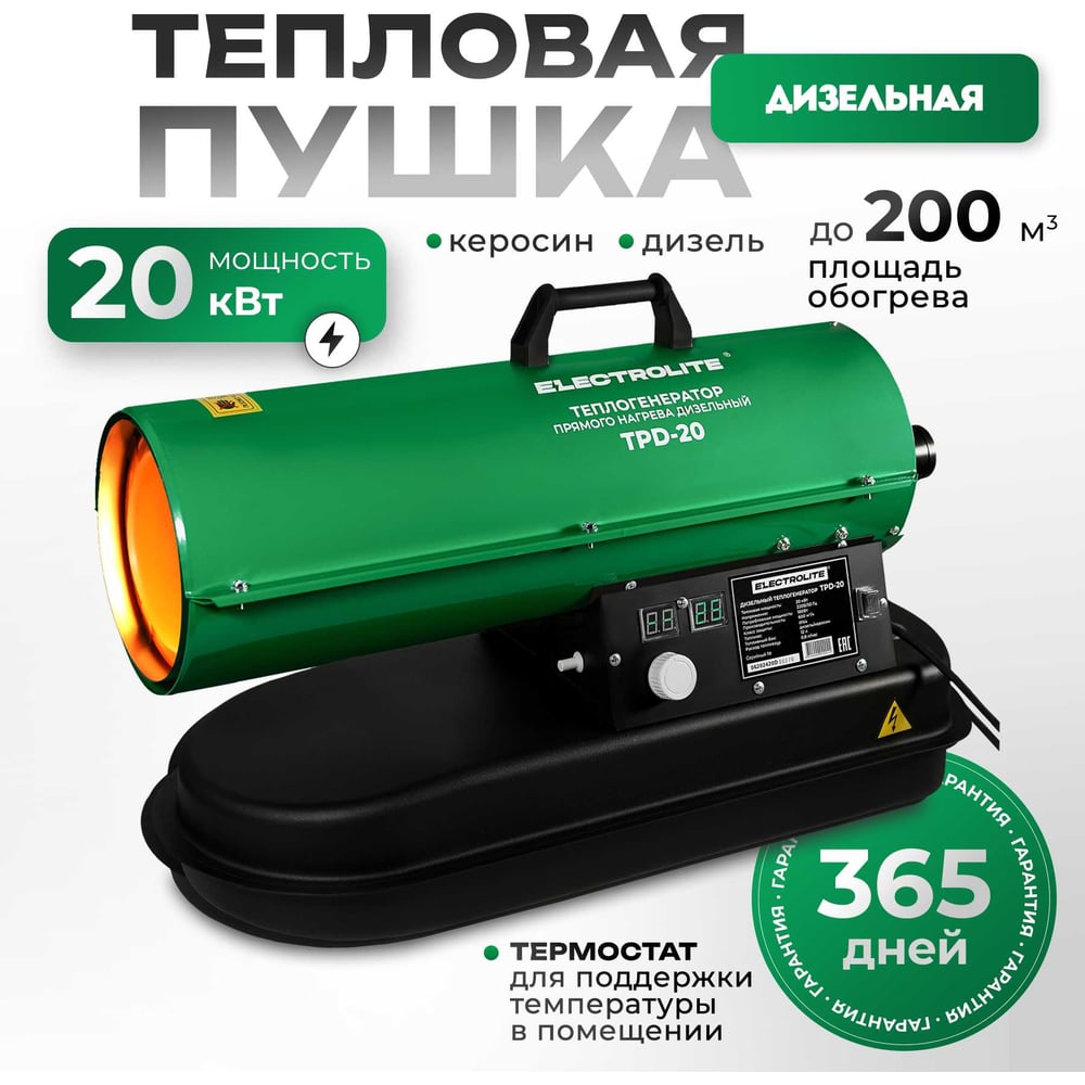 Дизельная тепловая пушка Electrolite TPD-20 EL (20000 Вт, 600 м3/час, 0.8 л/час, бак 12 л, ТЕРМОСТАТ) с регулировкой температуры 5061