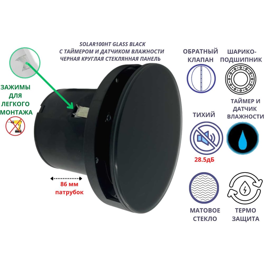 Круглый вентилятор VENTFAN.RU Solar100HT с датчиком влажности и таймером с черным стеклом, D100мм Solar100HT Glass Black