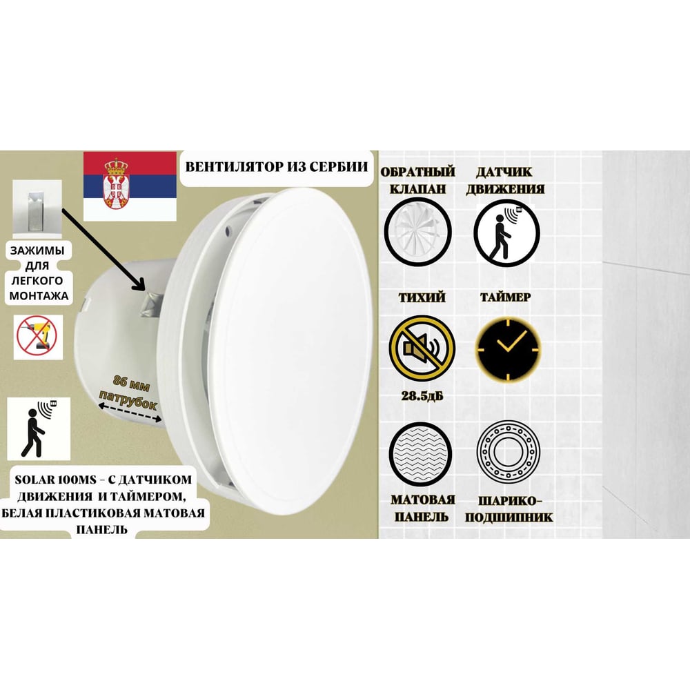 Круглый вентилятор VENTFAN.RU Solar100MS-K c датчиком движения и таймером, белый пластик, D100мм Solar 100MS-K PVC White