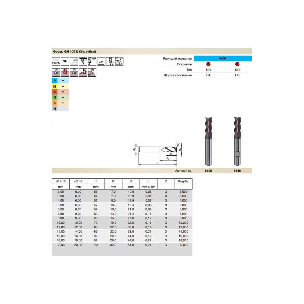 Фреза концевая Super Line GH100U (6 мм; Z=3; DIN6527L; твердый сплав; тип NH; FIRE) Guhring 5506 6,000