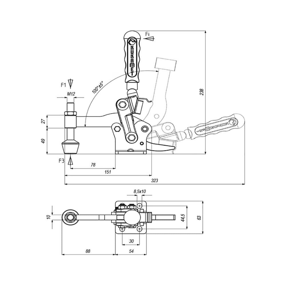 Прижим механический вертикальный со стопором KUKAMET, усилие 150 кг 241-4-L