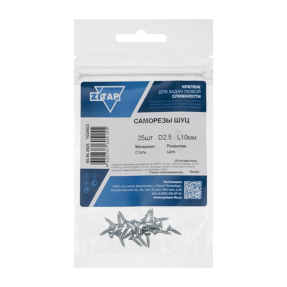 Саморез ШУц 2,5х10 потайная головка 25 шт, пакет Zitar 102403