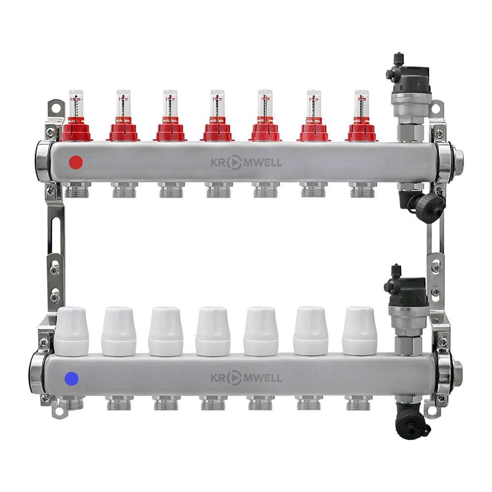 Коллекторный блок KROMWELL из нерж. cтали с расходомерами, в комплекте 1", 7x3/4", "евроконус" KW.SM6000675