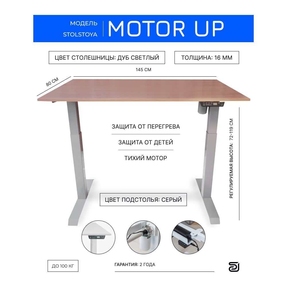 Стол с регулируемой высотой StolStoya МОТОР UP рама серая, столешница ЛДСП, Дуб светлый, 145x80 PE211ISSLDS145