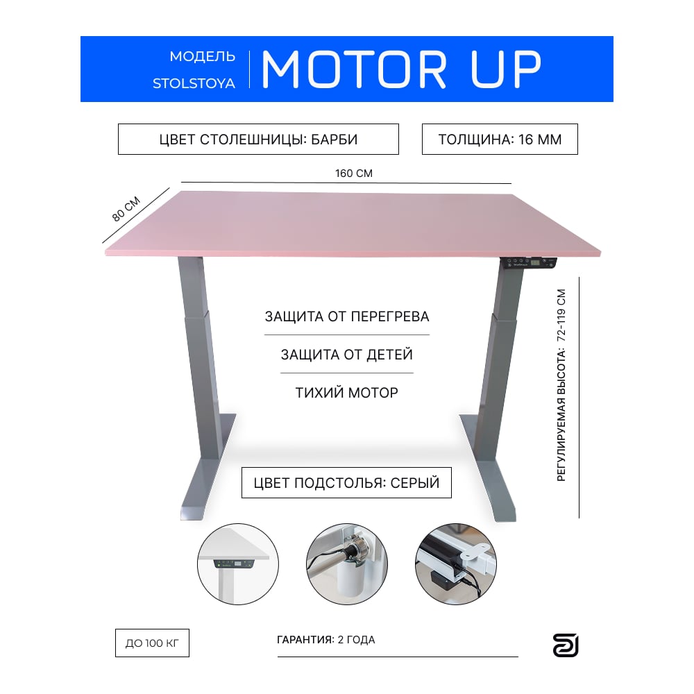 Стол с регулируемой высотой StolStoya МОТОР UP рама серая, столешница ЛДСП, Барби, 160x80 PE211ISSLBB160