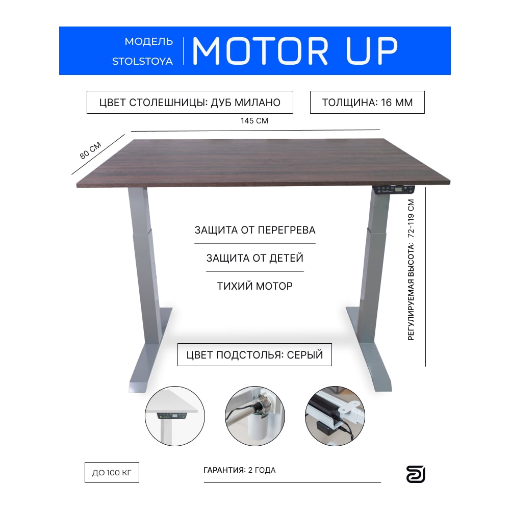Стол с регулируемой высотой StolStoya МОТОР UP рама серая, столешница ЛДСП, Дуб Милано, 145x80 PE211ISSLDM145