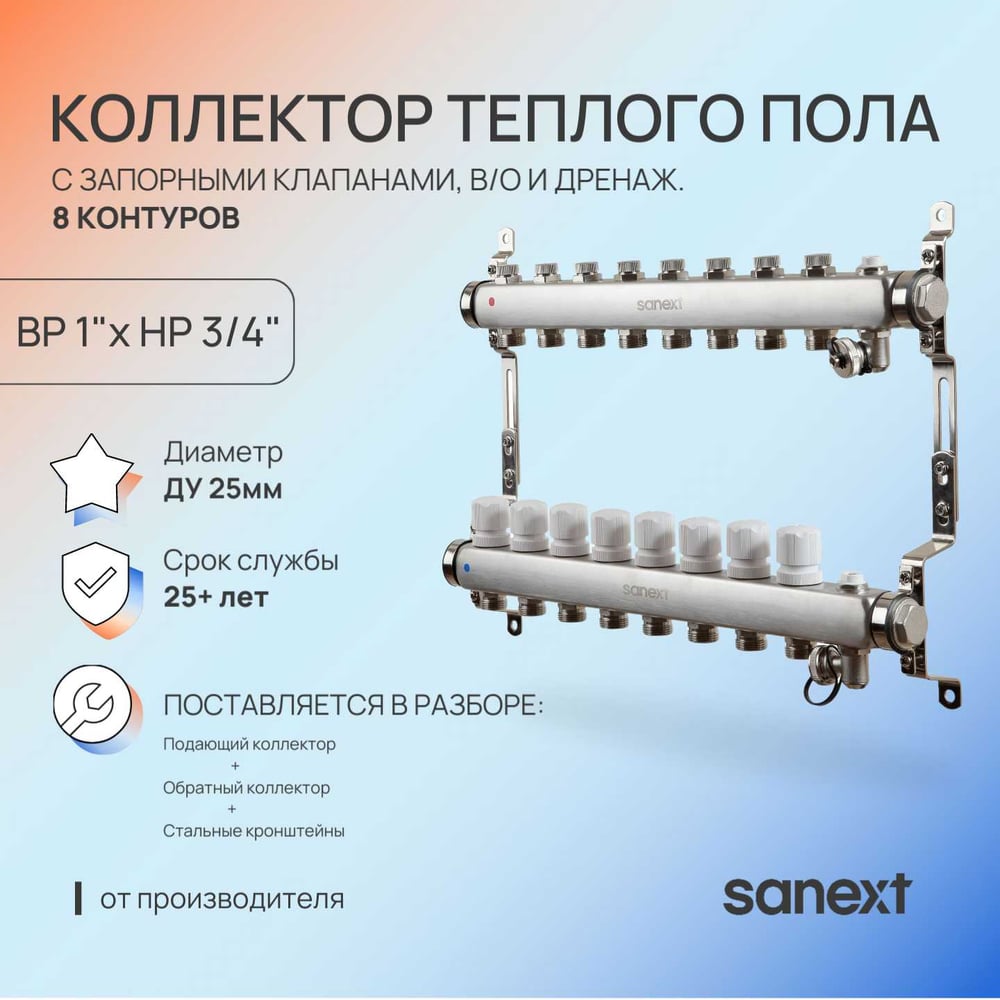 Коллектор для теплого пола SANEXT с запорной функцией, в/о и дренаж., ДУ25, ВР1"х 9 контуров НР 3/4" 8599